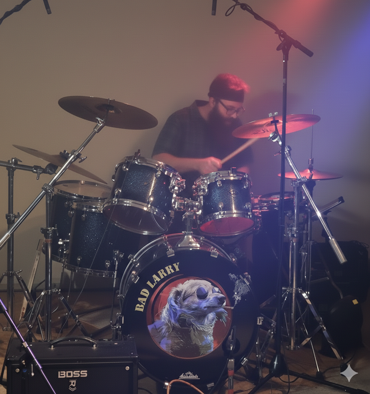 Dave Pardue on vocals, guitar and harmonica. Dave is the founding member of the Bad Larry Band but has also founded several other bands including Rock Steady Review and Mikey Likes It. Dave played in bands in California before moving north and starting new projects. He is a self-proclaimed equipment hoarder because, let's face it - you can never have too much equipment! Dave was Bad Larry's "Dad" and still has Larry's partner in crime, Curly. Curly is a happy rescue puppy and loves to say hi to the band members during rehearsals.